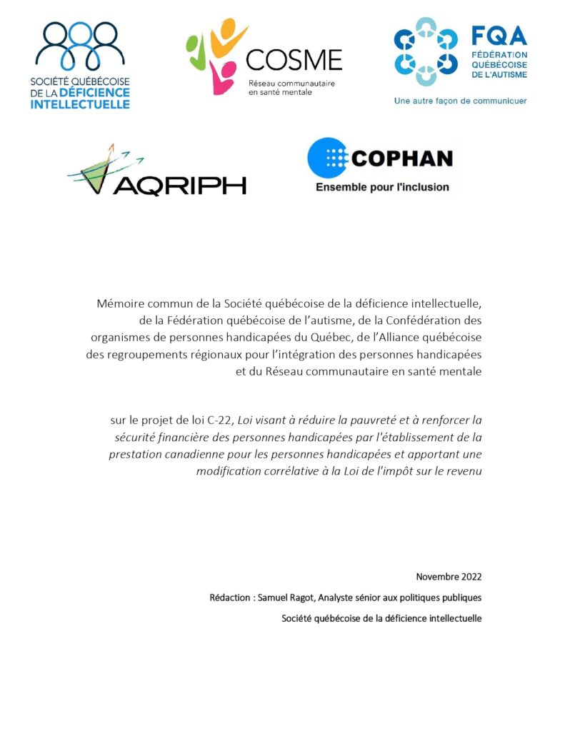 La Société québécoise de la déficience intellectuelle, la Fédération québécoise de l’autisme, la Confédération des organismes de personnes handicapées du Québec, l’Alliance québécoise des regroupements régionaux pour l’intégration des personnes handicapées et le Réseau communautaire en santé mentale présentent leur avis sur le projet de loi C-22, Loi visant à réduire la pauvreté et à renforcer la sécurité financière des personnes handicapées par l’établissement de la prestation canadienne pour les personnes handicapées et apportant une modification corrélative à la Loi de l’impôt sur le revenu.