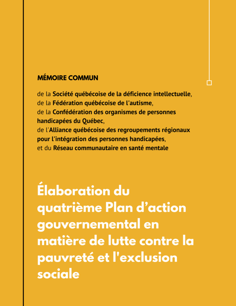 La Société québécoise de la déficience intellectuelle, la Fédération québécoise de l’autisme, la Confédération des organismes de personnes handicapées du Québec, l’Alliance québécoise des regroupements régionaux pour l’intégration des personnes handicapées et le Réseau communautaire en santé mentale présentent leur mémoire commun dans le cadre de l’élaboration du quatrième plan d’action gouvernemental en matière de lutte contre la pauvreté et l’exclusion sociale.