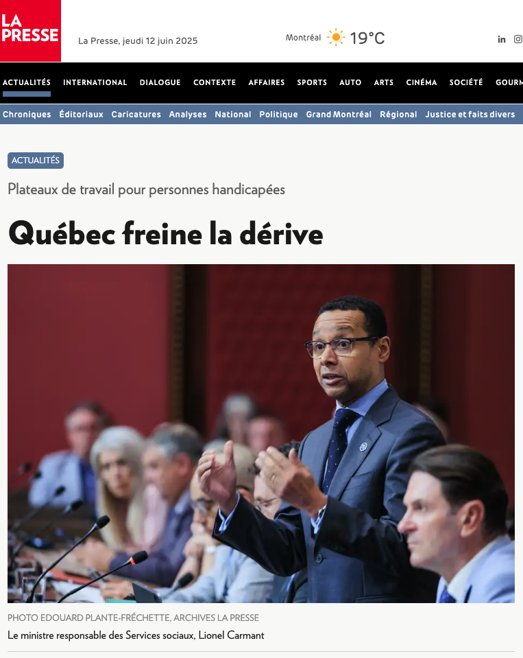 Rappelons que les quatre principaux organismes représentant les personnes handicapées au Québec ont choisi de ne pas participer à la plus récente Semaine québécoise des personnes handicapées pour protester contre « les reculs répétés du gouvernement en matière de services publics, d’inclusion et de respect des personnes handicapées ».