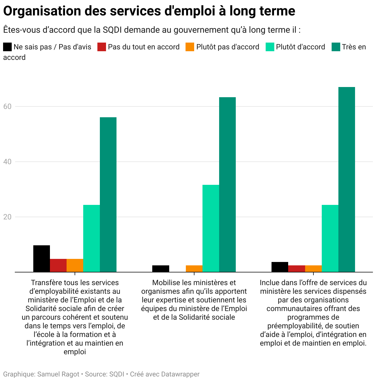 Les questions dans cette section visaient à comprendre votre position sur les enjeux liés à l’emploi en général. La SQDI voulait notamment clarifier et rendre plus clair le parcours vers l’emploi des personnes ayant une déficience intellectuelle, que le gouvernement mette l’accent sur l’accompagnement en emploi, et que les droits des personnes ayant une déficience intellectuelle soient respectés.